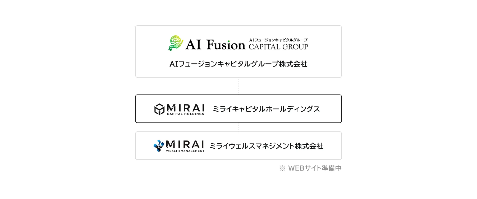 ミライキャピタルホールディングス株式会社は、AIフュージョンキャピタルグループのWEB3.0事業を牽引する持株会社です。今後、各事業領域に特化した子会社を設立し、WEB3.0事業全体の経営管理と業務統括を担うことで、持続的な成長と体制強化を実現します。技術革新が目まぐるしいWEB3.0と暗号資産の分野で、私たちは市場の変化に柔軟かつ迅速に対応します。グループ各社が密に連携し、シナジーを最大化することで、革新性と信頼性、そして安心感を兼ね備えたサービスを創出し、WEB3.0の新たな未来を切り拓いてまいります。